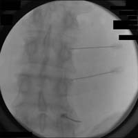 Lateral fluoroscopic view of a RF neurotomy procedure